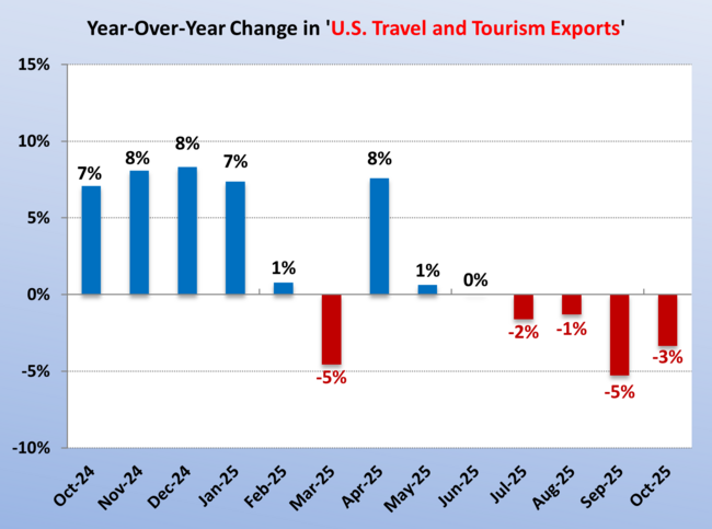 - Purchases of travel and tourism-related goods and services by international visitors traveling in the United States totaled $11.4 billion during October 2025 (compared to $11.9 billion in October 2024), down 4 percent when compared to the previous year. These goods and services include food, lodging, recreation, gifts, entertainment, local transportation in the United States, and other items incidental to foreign travel.